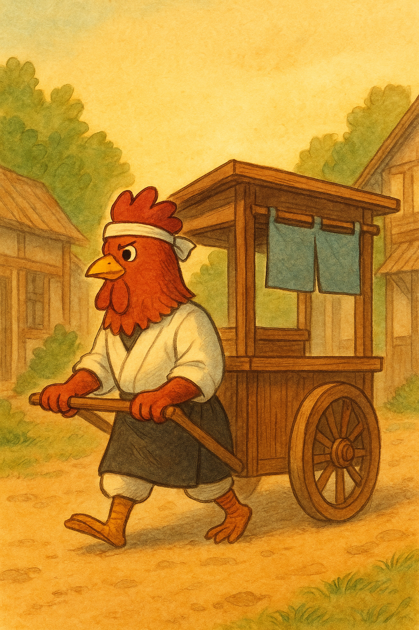 古びた屋台を押し、細い路地を歩く一羽のニワトリ。